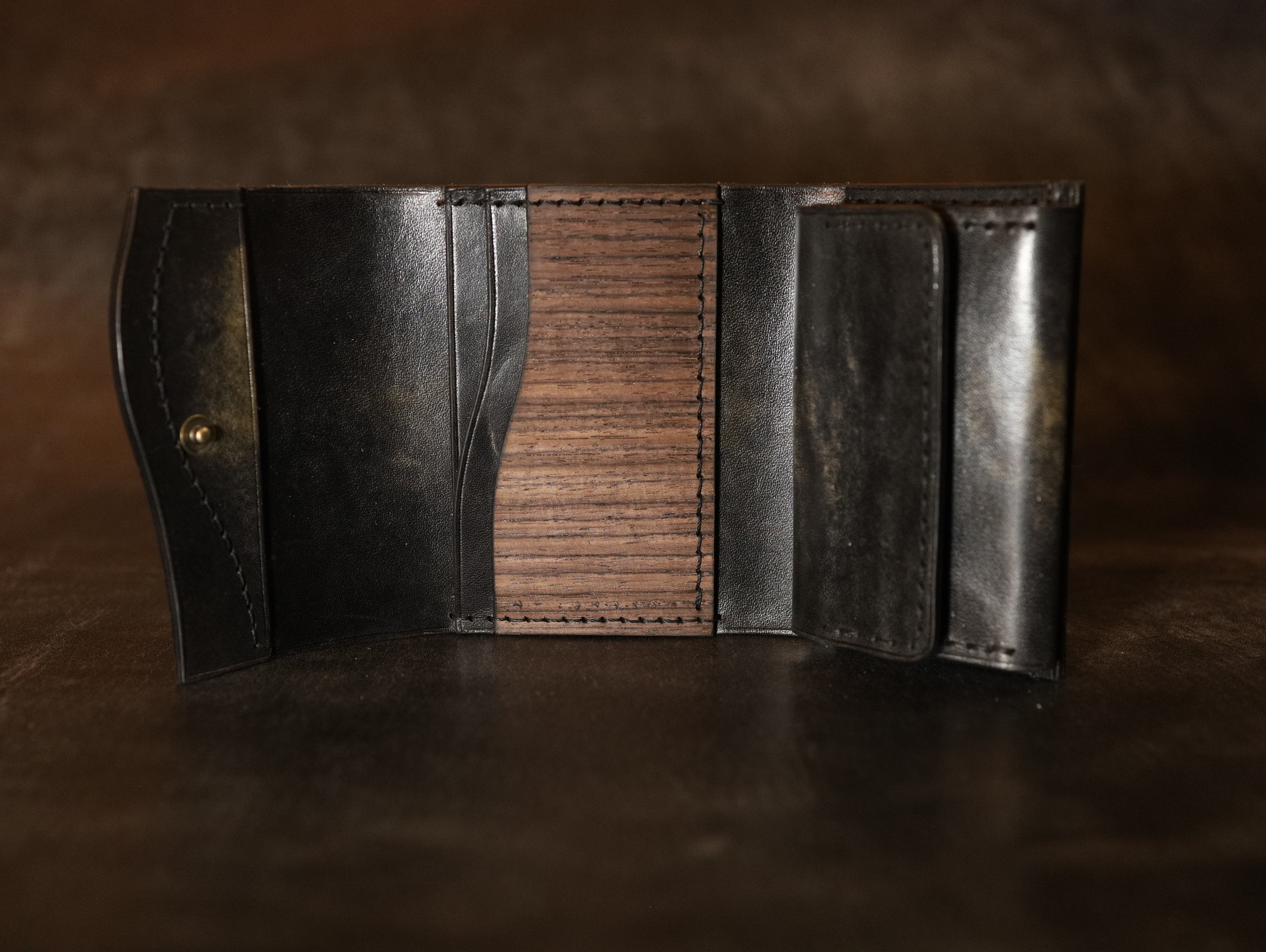 【天然木と革のコンパクトウォレット】ブラックアンティーク手染めの高級レザー 本革 ギフト プレゼント