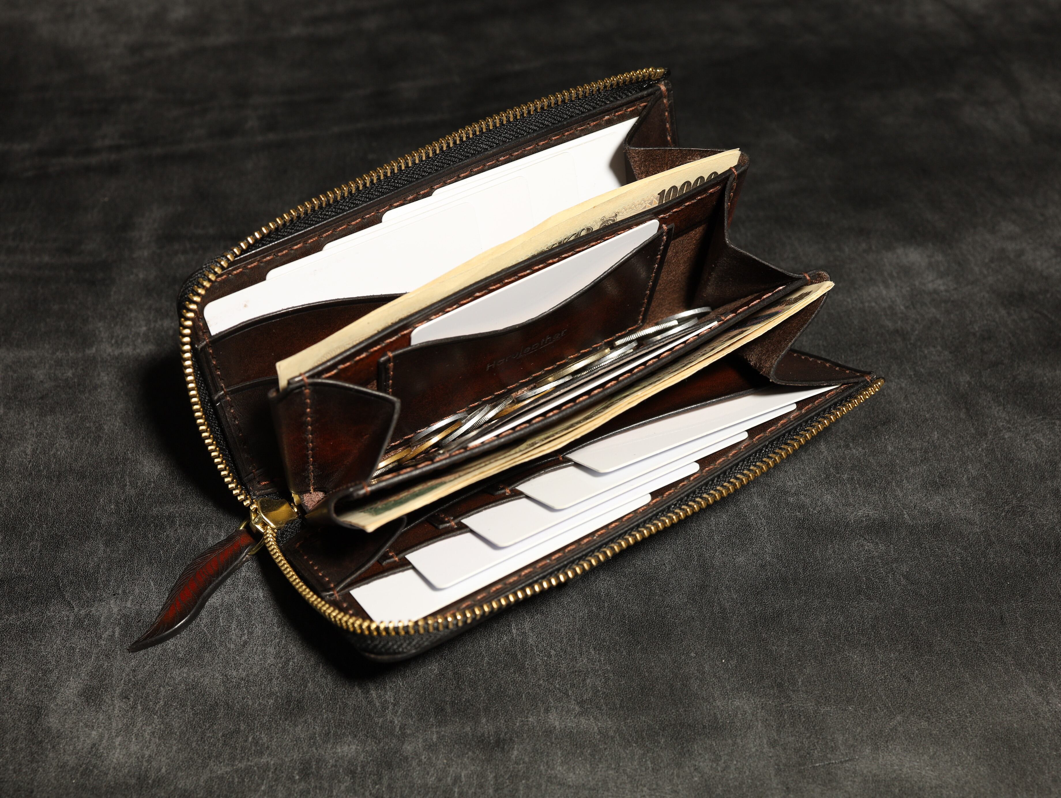 ヌメ革アンティーク染めラウンドファスナー長財布になります